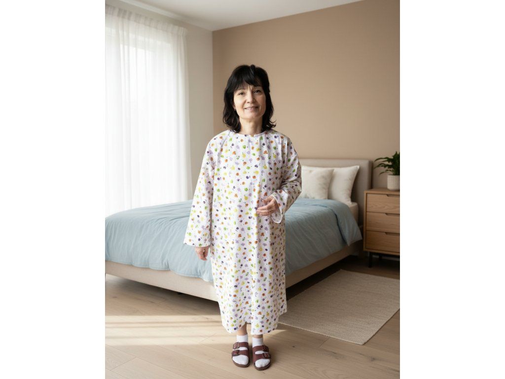Tradiční pacientská košile s kulatým výstřihem. Délka rukávů je 3/4. Zavazování na tkalouny vzadu.