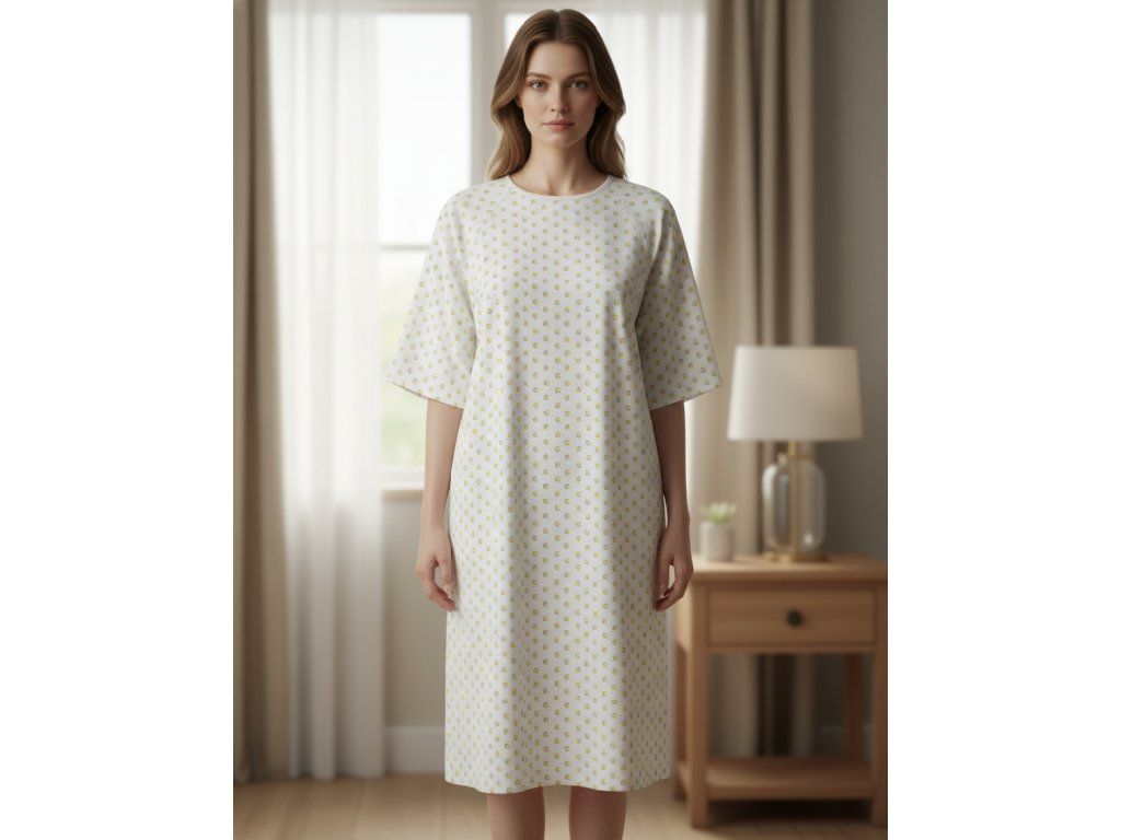 Tradiční pacientská košile s kulatým výstřihem. Délka rukávů je 3/4 nebo krátké rukávy. Zavazování na tkalouny vzadu.