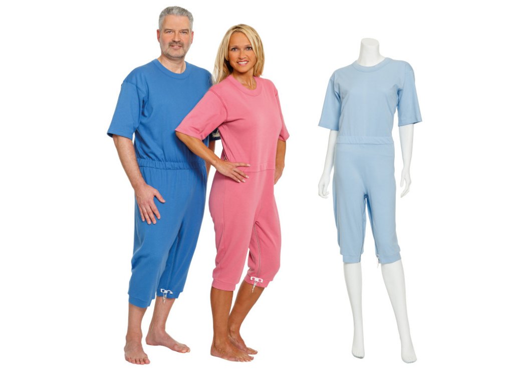 Krátký pacientský overal má jak zip na zádech, tak dělený zip na nohavicích. Podporuje a zjednodušuje péči například o pacienty s inkontinencí nebo demencí.