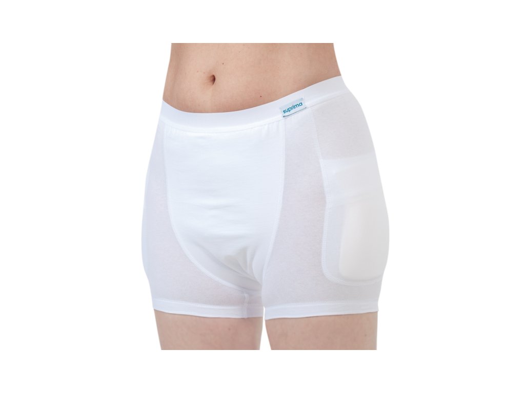Nohavičky Suprima s chráničom bokov poskytujú ženám účinnú ochranu pred zlomeninami krčka stehennej kosti a zraneniami v prípade pádu. Odev pacienta chráni priedušná, nepriepustná ochrana spodnej bielizne v spojení s inkontinenčným materiálom. Tieto hygienické a funkčné nohavičky majú bočné vrecká na vložky, ktoré sú ideálne na presné umiestnenie bedrových vložiek. Tie sa dajú presne vložiť do nohavičiek spolu s chráničom bedier a nie sú objemné. Vďaka veľmi dobrému padnutiu vďaka obsahu lycry v materiáli a praktickej ochrane spodnej bielizne ponúkajú nohavičky ženám vysoký pocit bezpečia pri aktivite aj pri ležaní.