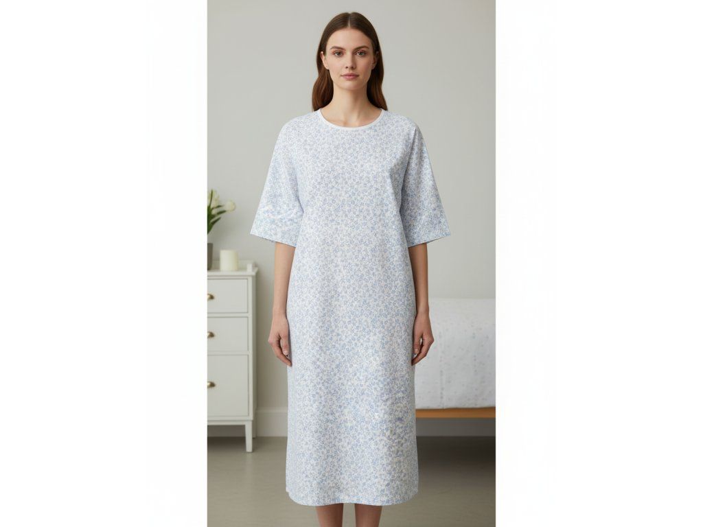 Tradičná pacientska košeľa s okrúhlym výstrihom. Dĺžka rukávov je 3/4 alebo krátke rukávy. Zaväzovanie na tkalúny vzadu.