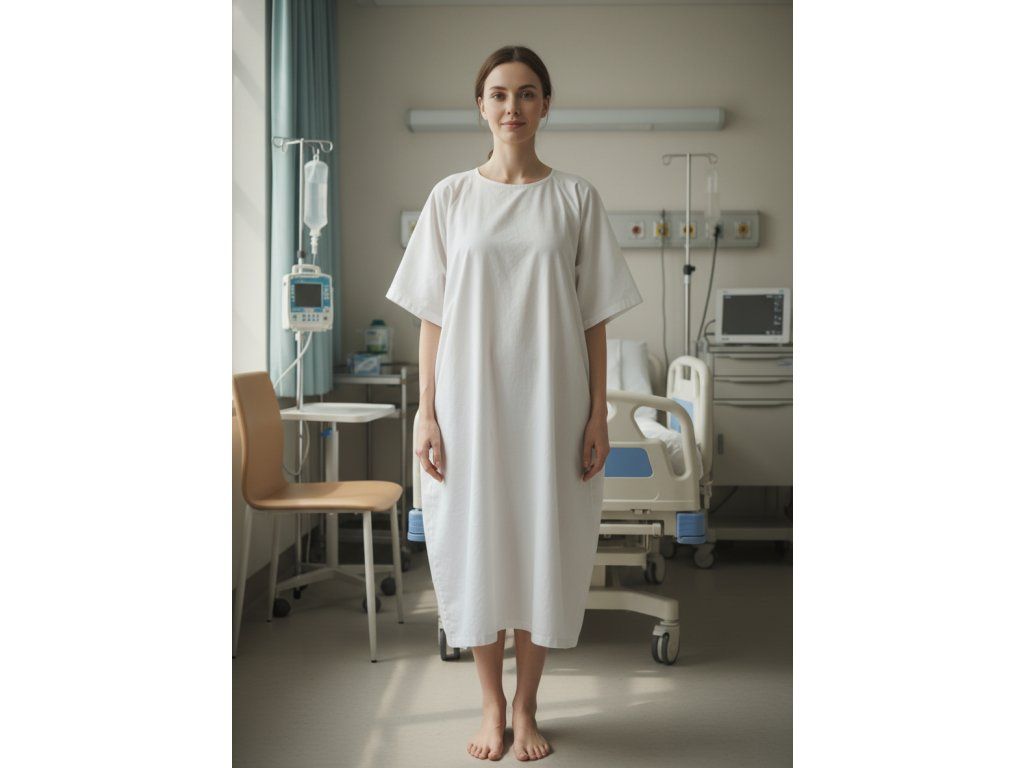 Tradičná pacientska košeľa s okrúhlym výstrihom. Dĺžka rukávov je 3/4 alebo krátke rukávy. Zaväzovanie na tkalúny vzadu.