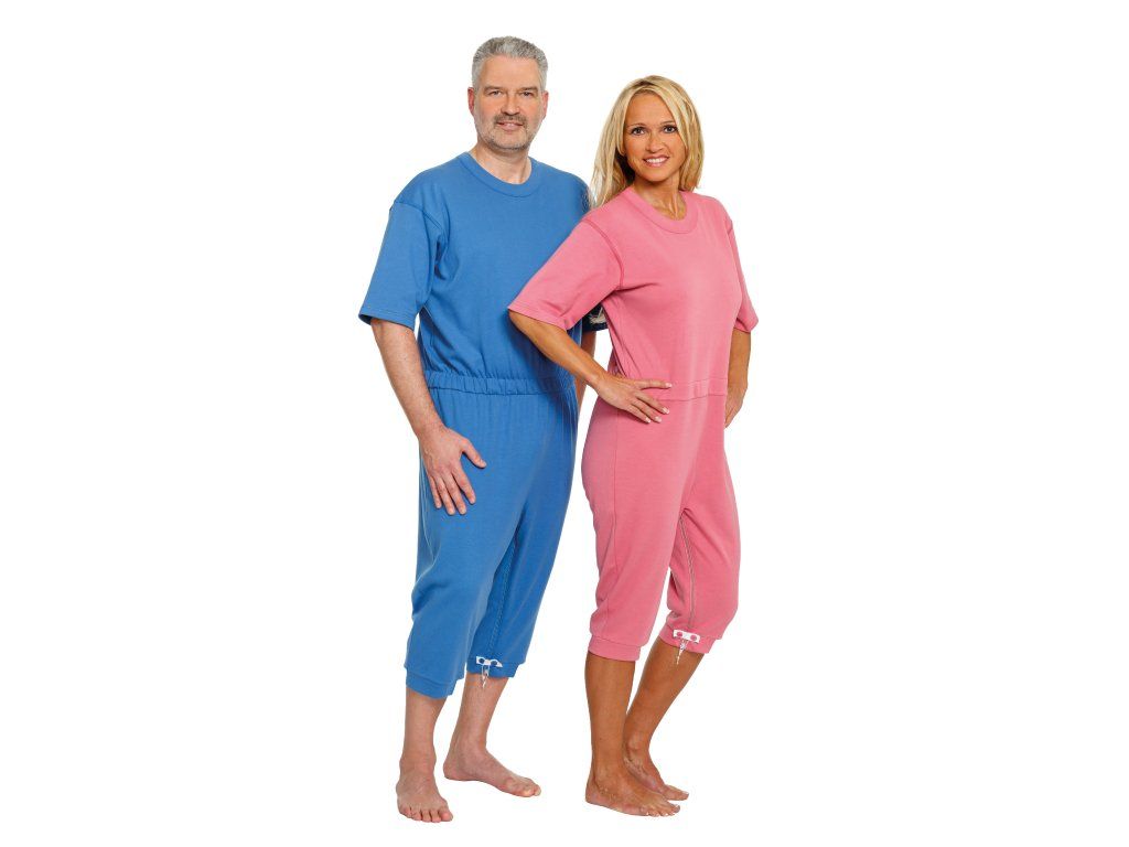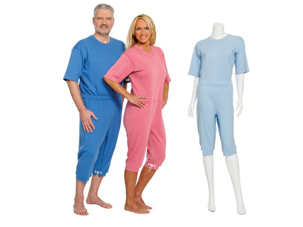Krátký pacientský overal má dělený zip v rozkroku. Podporuje a zjednodušuje péči například o pacienty s inkontinencí nebo demencí.